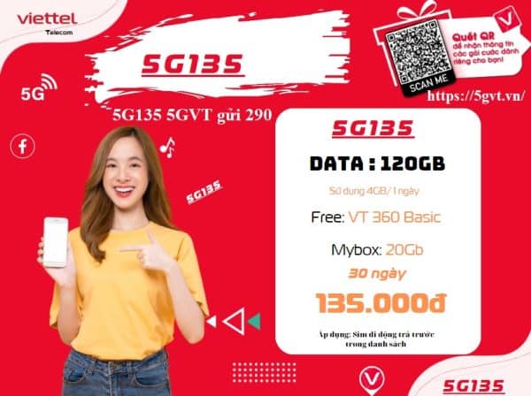 5G135 | 135.000đ | 120Gb Data tốc độ cao/ 30 ngày