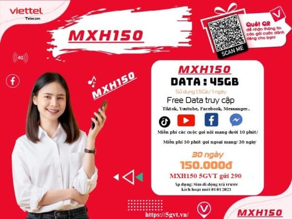 - Chắc hẳn bạn đang tìm kiếm một cách để thoải mái lướt mạng xã hội mà không phải lo lắng về việc hết data. Gói cước MXH150 của Viettel chính là giải pháp lý tưởng dành cho bạn.