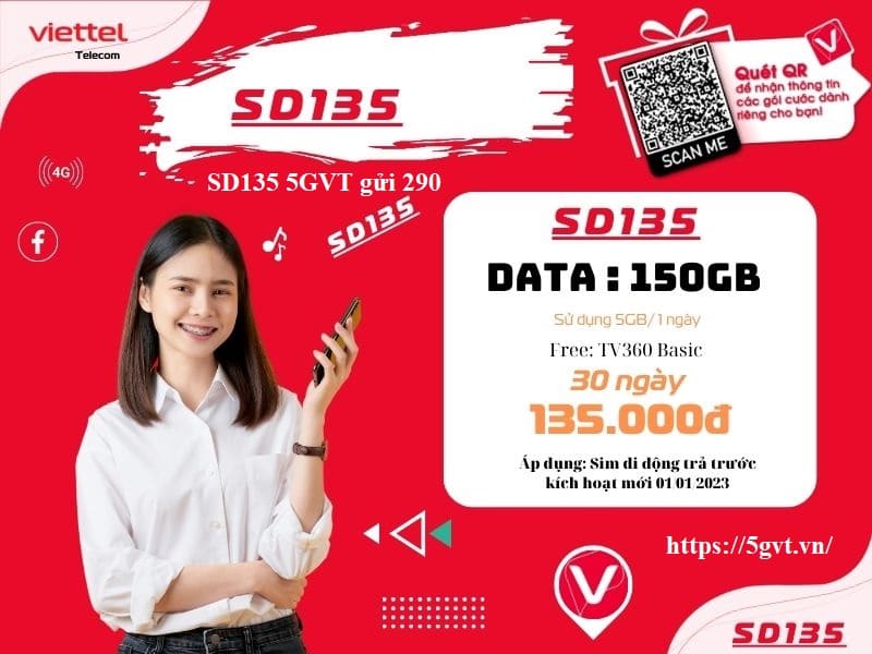 - Nếu bạn đang sử dụng mạng di động Viettel và đang tìm kiếm một gói cước 4G tốt với chi phí hợp lý, thì gói SD135 là lựa chọn lý tưởng dành cho bạn. Với mức giá chỉ 135. 000đ mỗi tháng, gói cước này cung cấp cho bạn 150GB data 4G tốc độ cao, giúp bạn thoải mái truy cập internet mà không lo về việc hết lưu lượng trong suốt 30 ngày sử dụng.