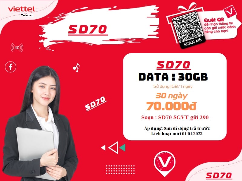 Nếu bạn là người sử dụng mạng di động Viettel và đang tìm kiếm một gói cước 4G 5G chất lượng với chi phí hợp lý, gói cước SD70 có mức giá 70. 000đ cho 1 tháng có thể là lựa chọn hoàn hảo dành cho bạn. Gói cước này mới được Viettel ra mắt dành cho thuê bao di động trả trước kích hoạt từ đầu năm 2024.