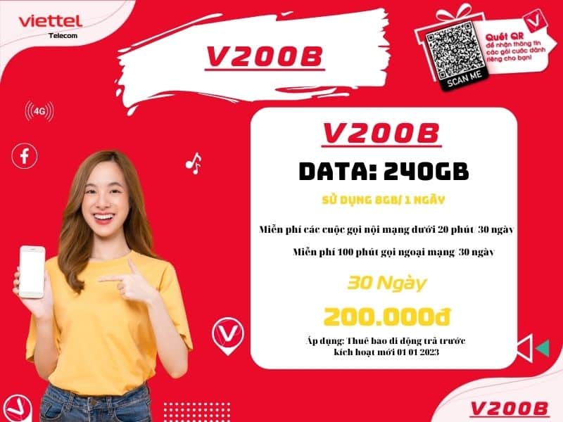 • Data: Miễn phí 240Gb data 4G tốc độ cao của Viettel/ 30 ngày. Mỗi ngày sử dụng 8Gb data.